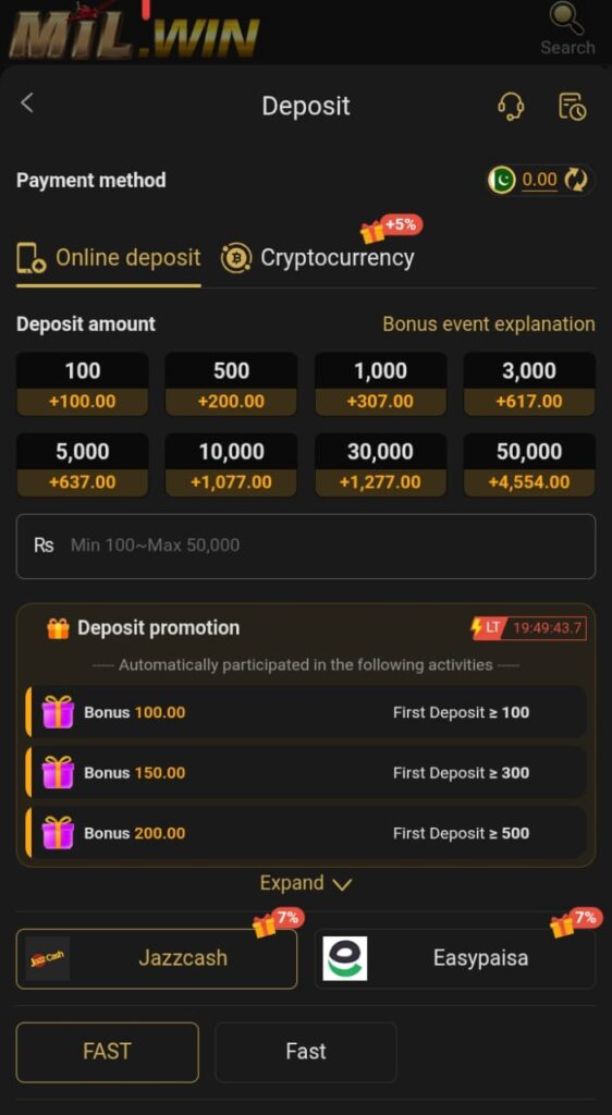 MilVin download Game provides a quick and convenient deposit process for Pakistani users: